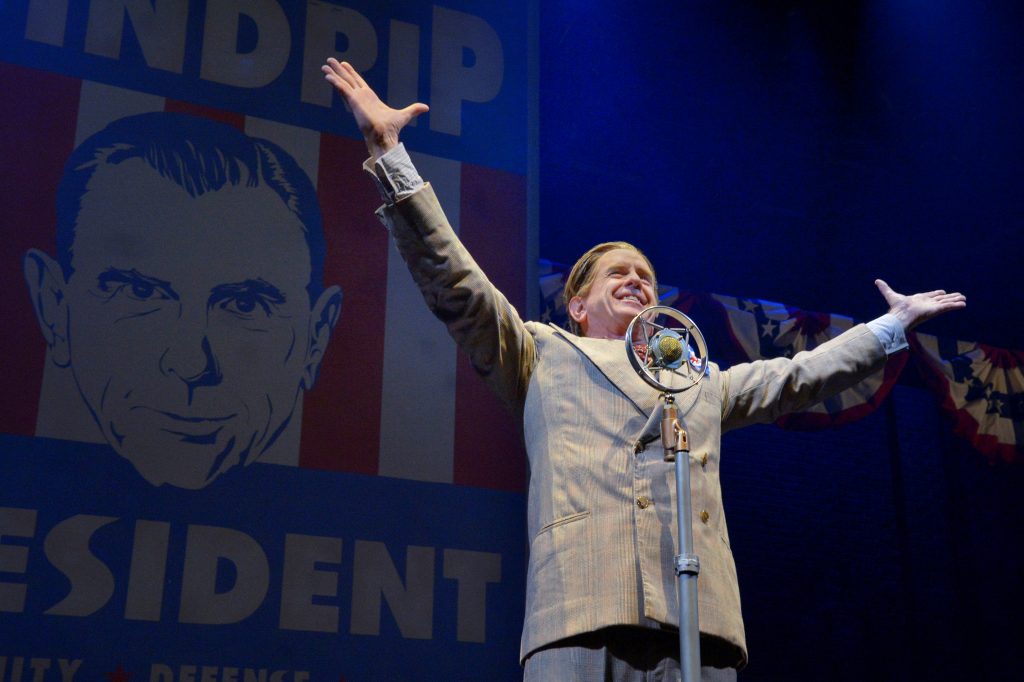 As Buzz Windrip continues to gain the favor of voters, patriotic journalist Doremus Jessup (a quietly commanding Tom Nelis) vows to stop this storm. Tall, elegant, gray-bearded Nellis has a sturdy presence that reminds us of Gregory Peck’s Atticus Finch in To Kill a Mockingbird. Wise and composed, Jessup is the perfect foil to the selfish and erratic Windrip. Jessup stands up for the democratic philosophy of the American Revolution. We trust Doremus Jessup, because he asserts a basic American optimism.
