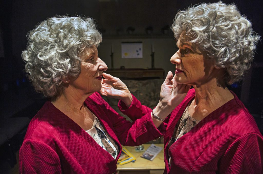 The performances, all three, are perfectly calibrated to draw us into the story of the shadowy, elegant, well-dressed elderly twin ladies, who are hiding out in their apartment—much like the Berkeley City Club parlor. They are attacking and alarming each other; they know each other’s secrets and vulnerabilities from thirty years of co-habitation.