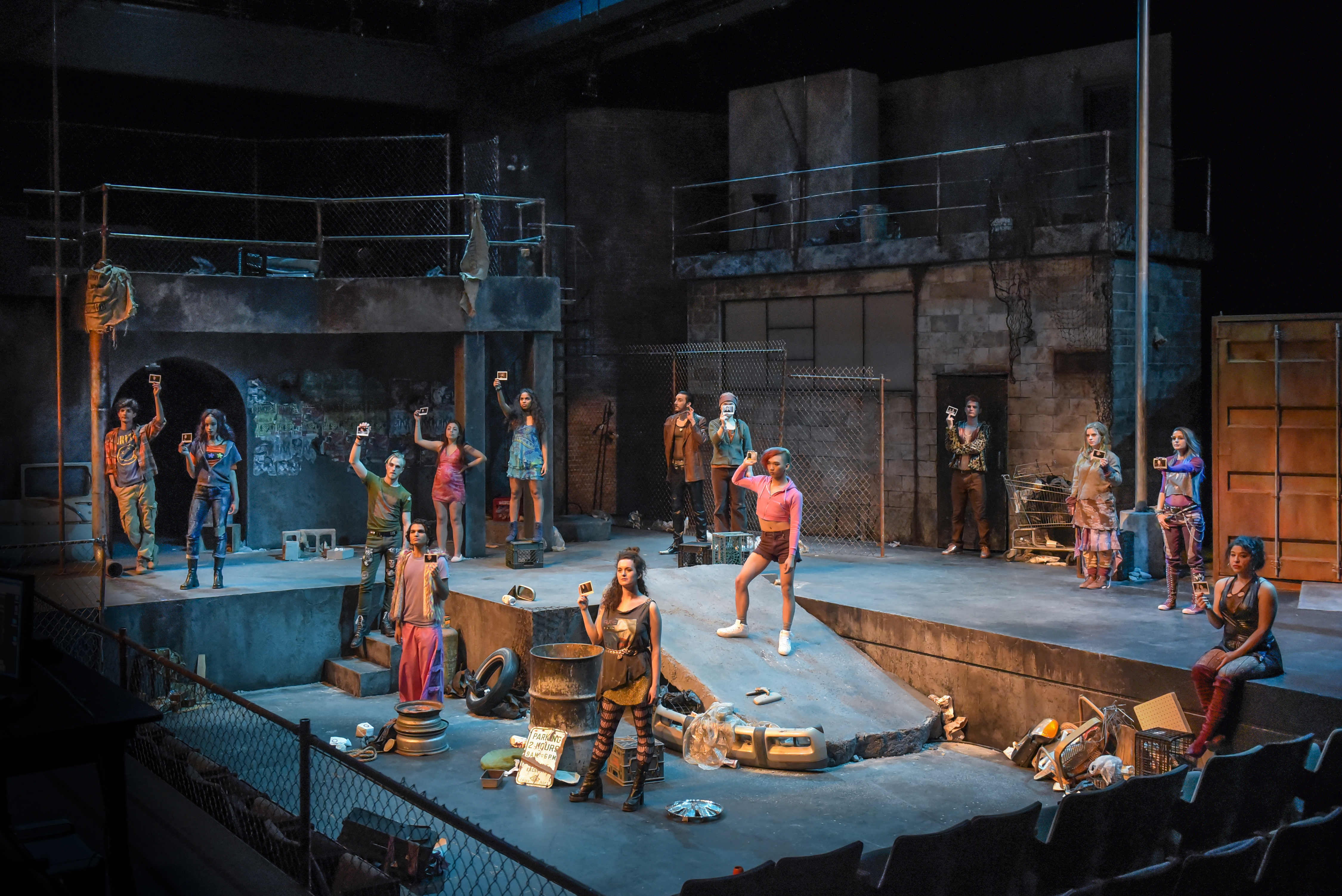 On one end of the set, the lights pick out a hidden room for seduction, a false paradise for the kids who live on the streets, with cool colors that highlight the darkness. On the other end, fires flash from Hades, fencing the characters behind wire fences, keeping them apart.