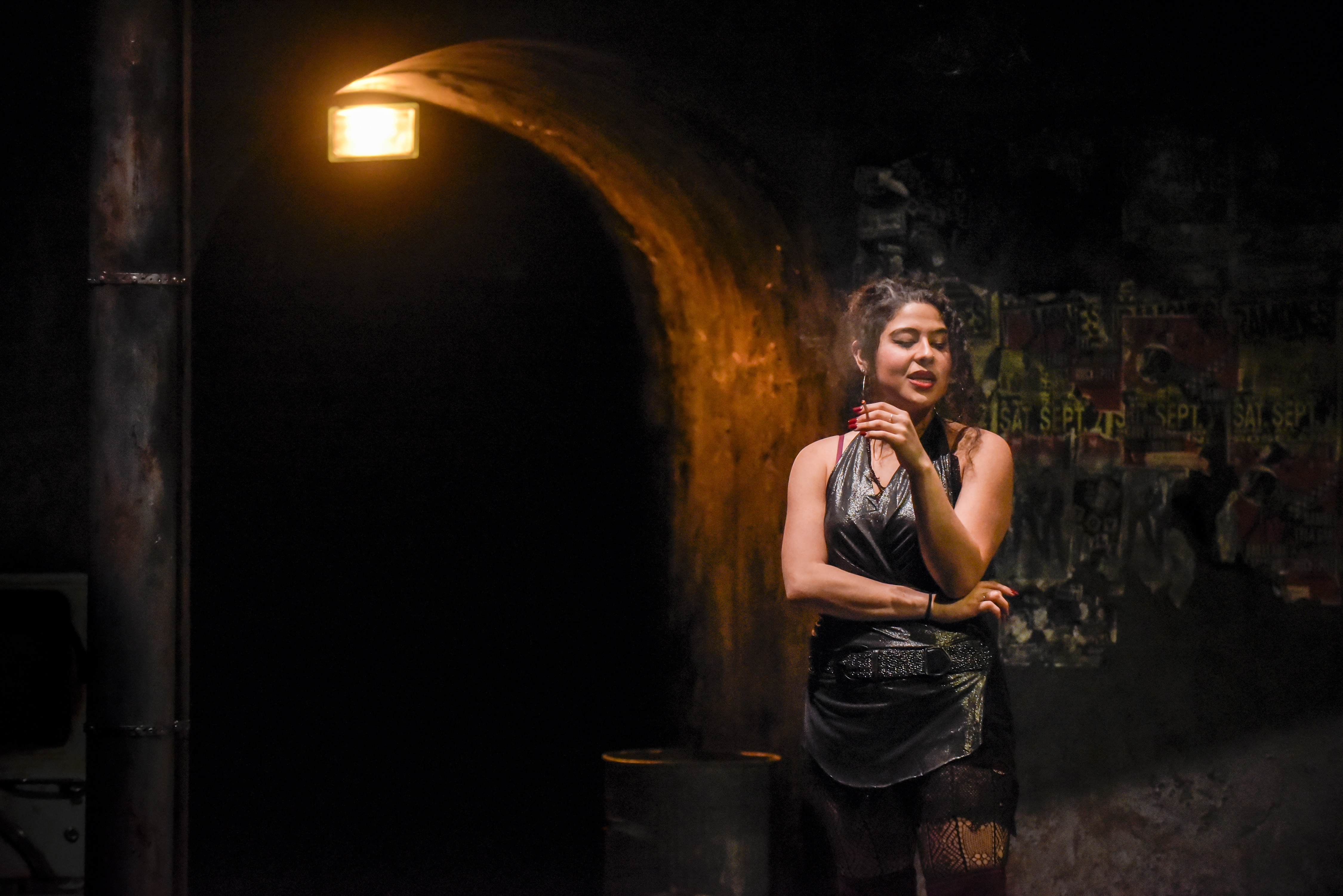 Main characters are highlighted by their bright colored hair and costumes, set against the gray, run down, cement tenements. Persephone (the savvy Jordan Don) is queen of the underworld and queen of the streets wears delicious cherry-colored knee-high boots with matching cherry underwear over fishnet tights. Classic. Jordan Don’s Persephone delivers horror, sorrow, and anger while allowing a regal denial of the truth. Don’s no nonsense streetwalker dominates the Underworld with wisdom and poise. Her lyrical monologue provokes tears and awe when she reluctantly reveals her story.