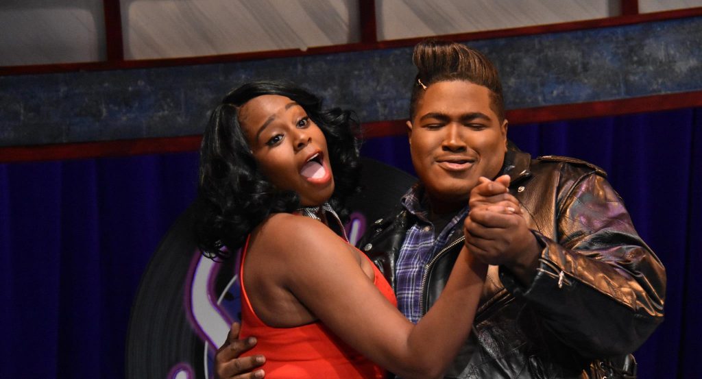 I was carried back to sock hops in high school, dancing cheek to cheek with my favorite girl. The cast delights us with their fine singing and dancing, coupled with their hilarious comedic talents. The room is hopping. If you want a great time and a trip down Memory Lane, head over to Town Hall Theatre for some fun.