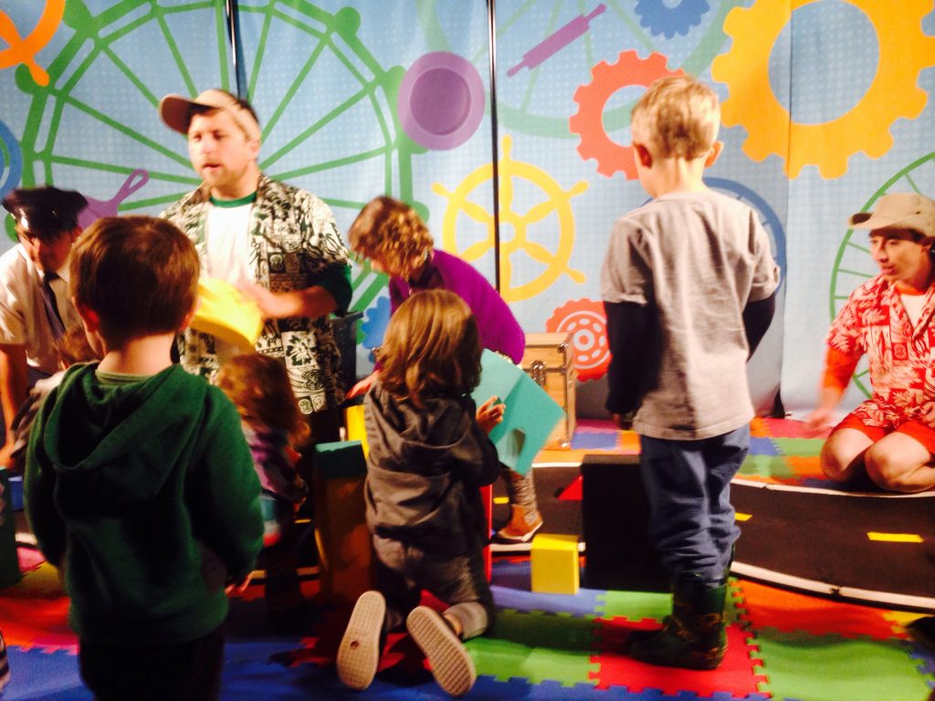 But the moment music started playing inside what looked like a glowing tent, Itasca was interested and curious. We followed the small crowd of toddlers and parents inside the “theater,” where circles of carpet designated “seats,” should we wish to use them. Two men were inside, playing with wooden cars on the floor, making up dramatic sound effects. It was an invitation to play, spoken in the simple language of children. And many of the children did play, building trains with the cars, sliding them across the floor, or simply taking the toys back to show Mom or Dad.