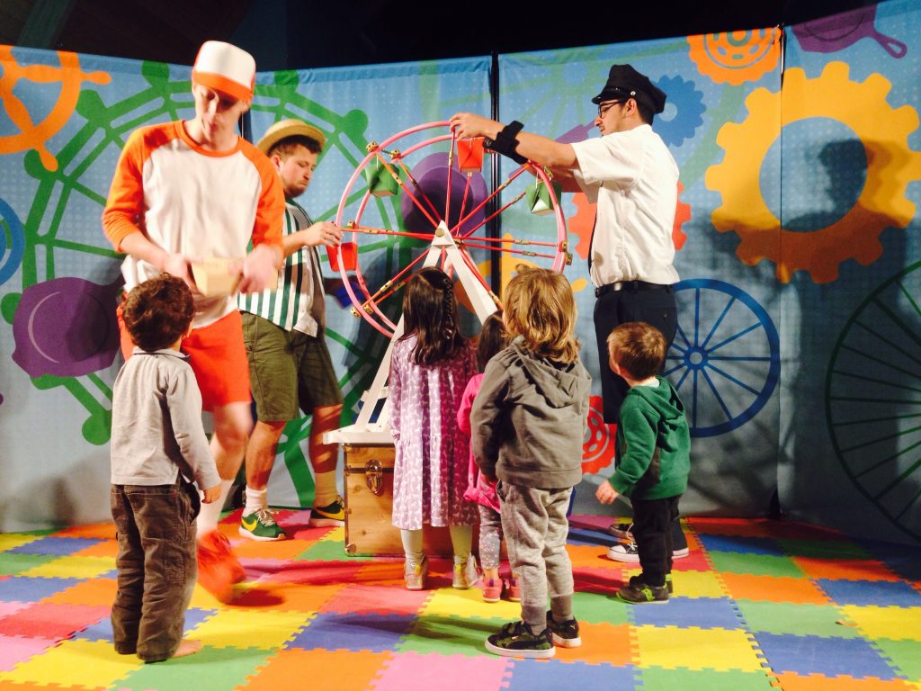 And then we were off on an adventure that flew by, thanks to scenes designed to engage children on a variety of levels, and that ended before anyone could get bored. We went to a carnival where we ate imaginary cotton candy and where Orange Man and Green Man constructed a miniature Ferris Wheel. We flew like airplanes. We made an enormous pizza and played a call-and-response clapping game with pots and pans. And of course, we rode the bus over bumps and around sharp turns.