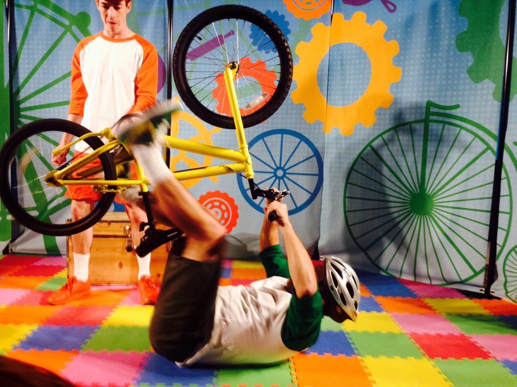 The two main actors were phenomenal, acting with their faces, voices, bodies, and props, and rolling with the punches. The funniest moment in the performance came during a cooking scene, where Green Man and Orange Man made a creature who had an egg beater for legs, two wooden spoons for arms, and two pizza cutters for eyes. Green Man, who was operating the creature’s arms, accidentally dropped a spoon. Orange Man, who was operating the eyes, and voicing the creature, didn’t even hesitate. He made the creature yip and scream in shock—then gasp and splutter in relief as Green Man re-attached the arm. The room burst out in laughter, the parents laughing even harder than the children.