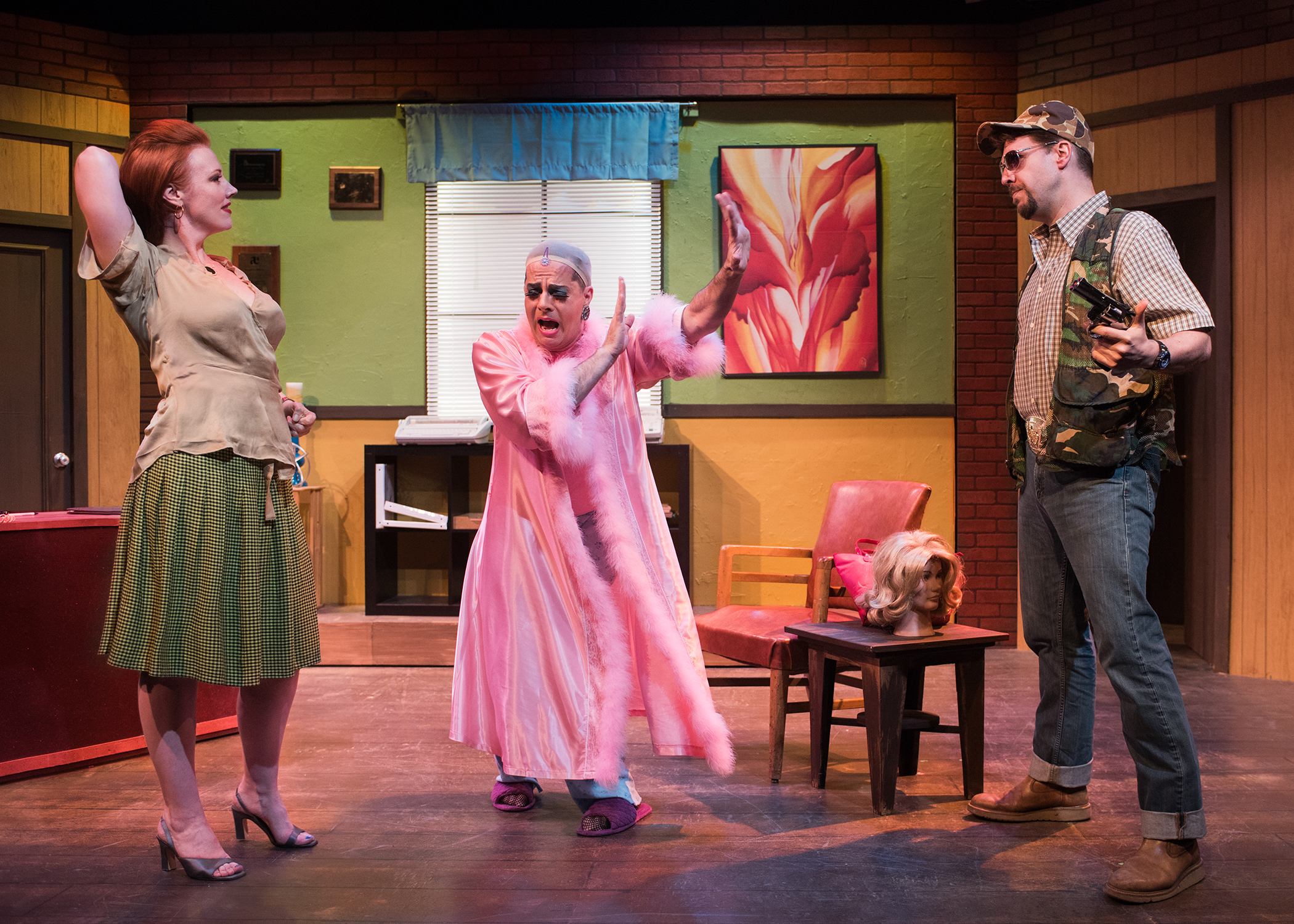 You see, Mama died in a cheap motel when she tripped over the wooden legs of her lover, GW. GW’s wife Noleta (a side-splitting Shannon Kase) comes over to apologize for her husband, but mainly consumes mass quantities of fried chicken and valium.