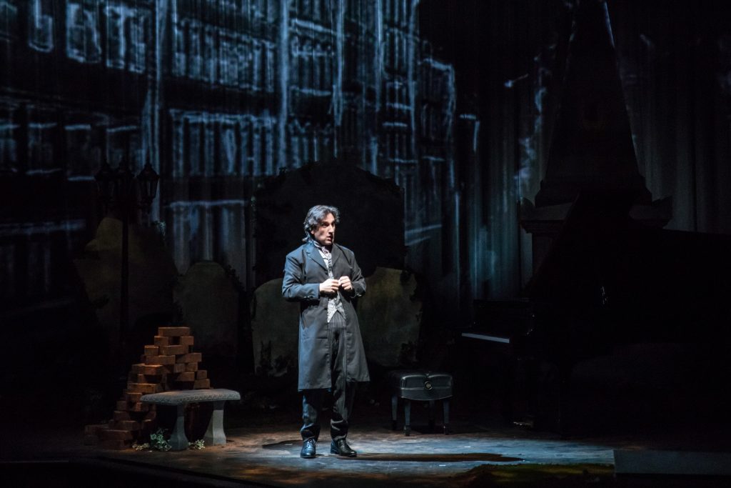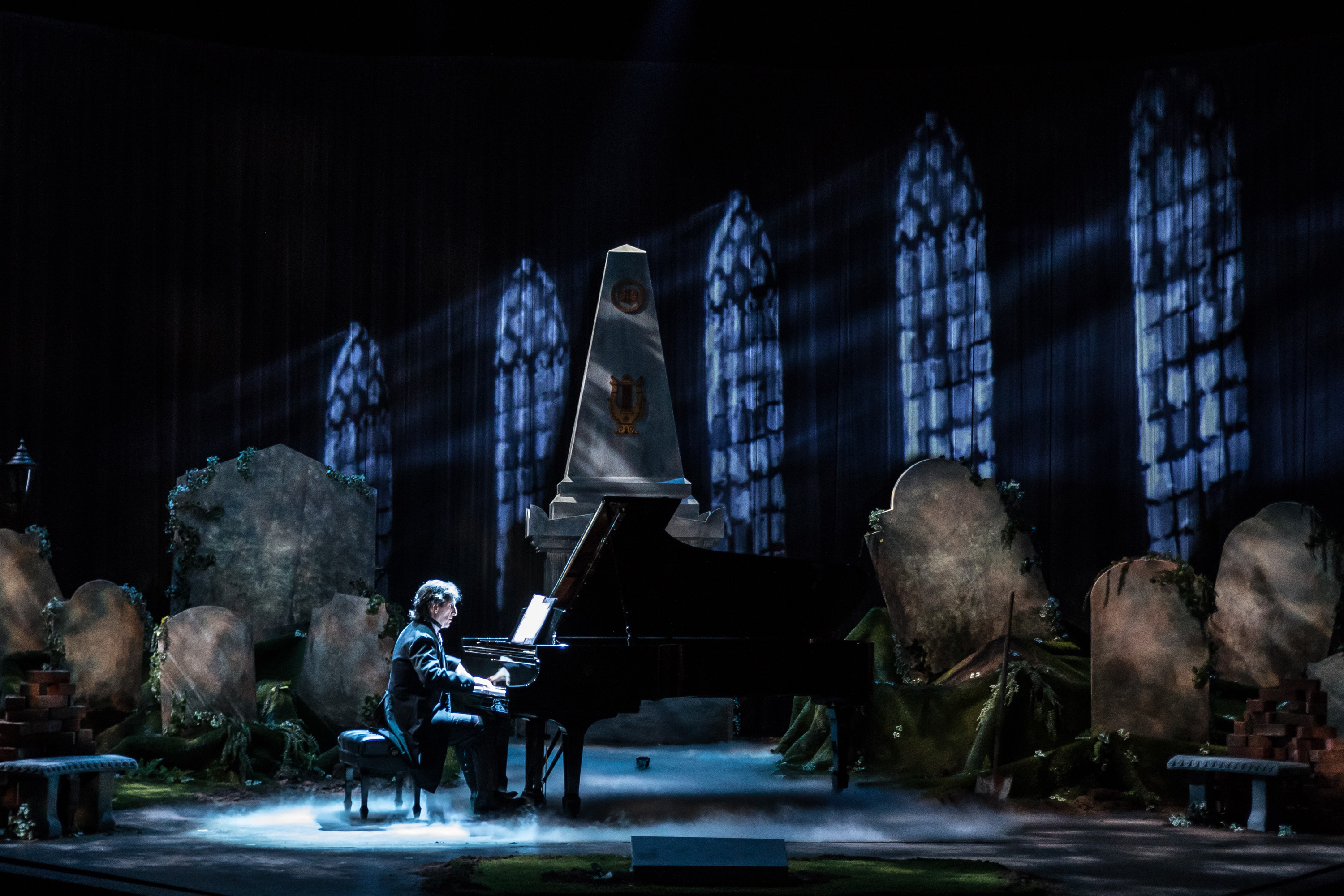 But here, amidst shadowy tombstones and elegant 18th Century furnishings, bookshelves, and a sprinkling of stars—Hershey Felder brings us the love that Dr. Breuning feels for his older friend. The good doctor looks at the surviving bones from the inner ear of the composer, after his death, and wonders if we will ever understand the mystery of B’s deafness, and the misery that afflicted him.