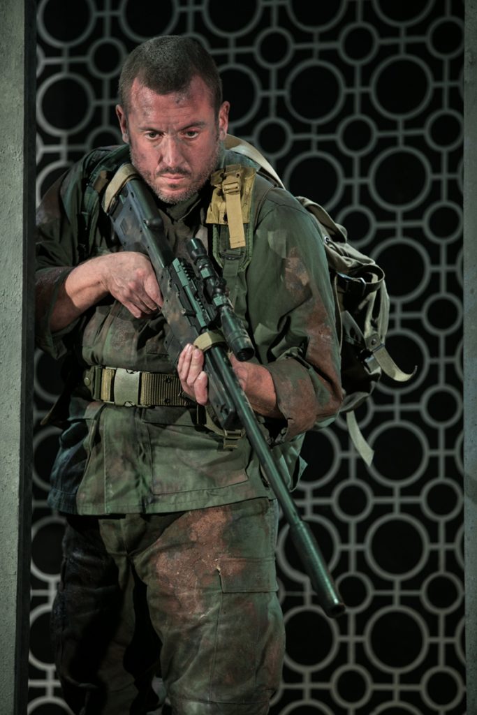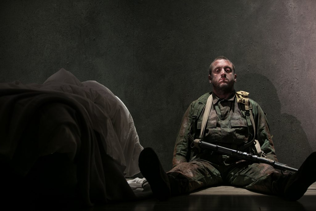 As the fully-armed Soldier who suddenly appears, the tormented Joe Estlack embodies the horrors of war in one machine gun toting military man. The Soldier descends out of the sky from the Serbian War, in which the UK and US played a big part.