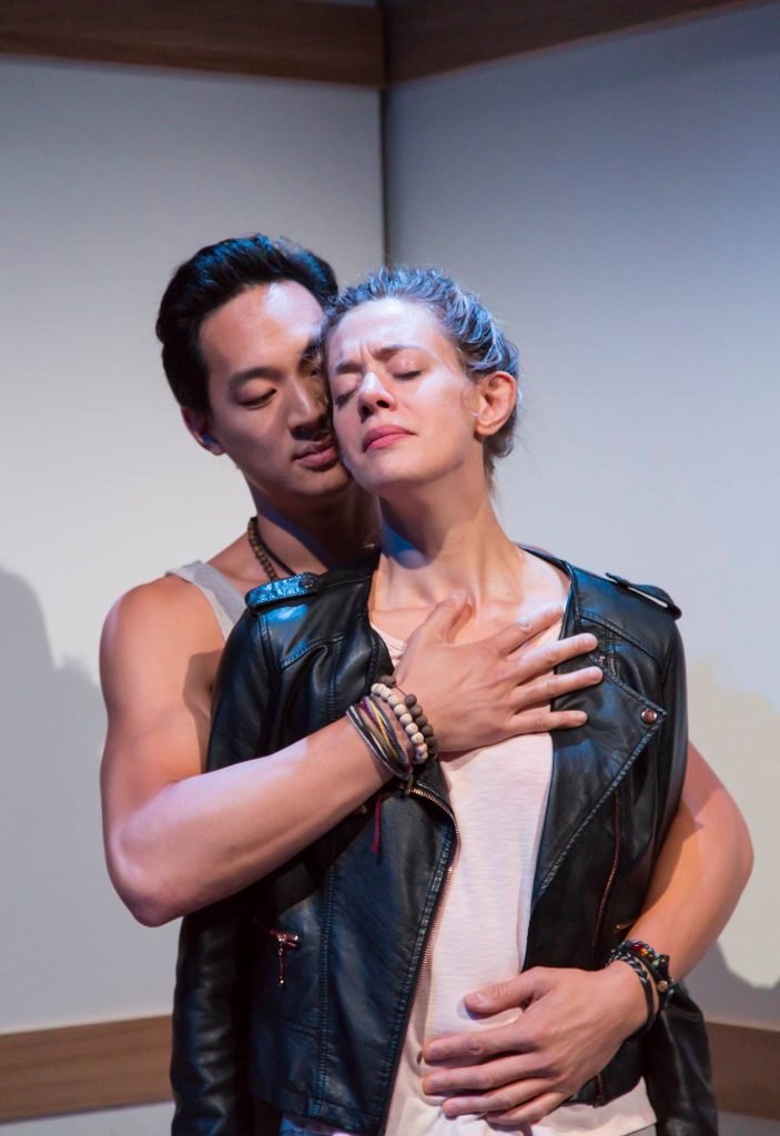 When it’s time for the six to go their separate cabins, the whole room slides back smoothly, and the three sets of “roommates” try to get along with strangers. Yoga instructor Rodney (stately Edward Chin-Lyn) is paired with a nervous Ned (energetic Ben Beckley), the perfect odd couple. Ned, a super sensitive guy in a strange woolen ca, is instantly offended by Rodney’s disobeying the meditation rule book. Ned is a compulsive rule-follower; Rodney, superior and exhibitionist, makes his own rules.