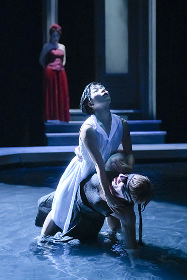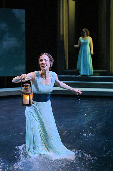 Scenic Designer Daniel Ostling provides us the large pool of water that fills center stage surrounded by a walkable wooden deck, with a simple backscreen of blue sky and clouds and a giant crystal chandelier. A raised platform that overlooks the pool, serves as home for the gods.